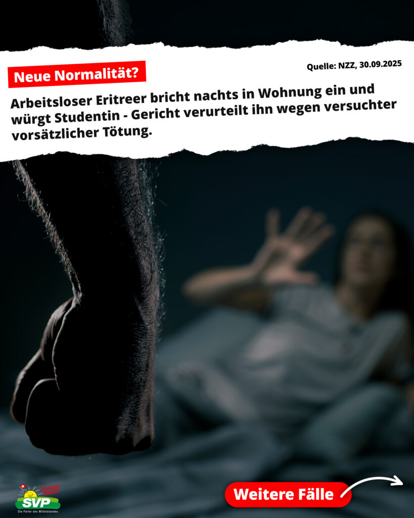 Raubüberfalle, Vergewaltigungen, Messerstechereien und Einbrüche sind an der Tagesordnung. Insbesondere kriminelle Asyl-Migranten verüben teils schwerste Gewalttaten. Das herrschende Asyl-Chaos gefährdet die innere Sicherheit der Schweiz und kostet die Steuerzahler Milliarden. Statt die Grenzen zu kontrollieren, verweigert der verantwortliche SP-Bundesrat Jans griffige Massnahmen zum Schutz der eigenen Bevölkerung.