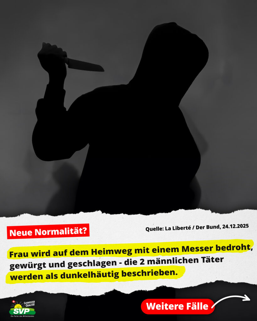 Raubüberfälle, Vergewaltigungen, Messerstechereien und Einbrüche sind an der Tagesordnung. Insbesondere kriminelle Asyl-Migranten verüben teils schwerste Gewalttaten. Aufgrund der offenen Grenzen können sie ungehindert in unser Land kommen. Trotzdem verweigert SP-Bundesrat Beat Jans Grenzkontrollen. Es ist höchste Zeit, die innere Sicherheit der Schweiz wiederherzustellen. Unterschreiben Sie deshalb jetzt die Grenzschutz-Initiative! https://grenzschutzinitiative.ch